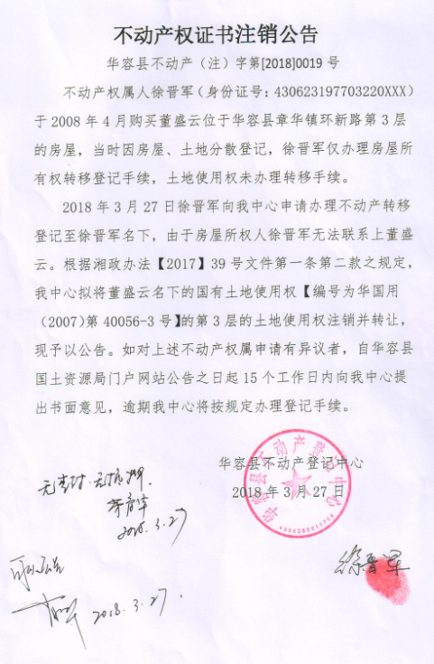 不动产权证书注销公告【国有土地证(董盛云转徐晋军)】