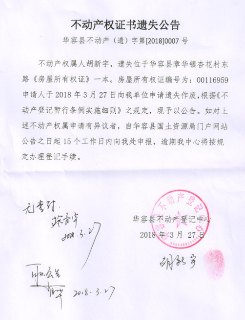 不动产权证书遗失公告【房屋所有权证(胡新宇)】