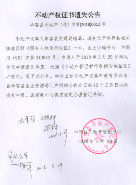 不动产权证书遗失公告【国有土地证(华容县交通运输局)】