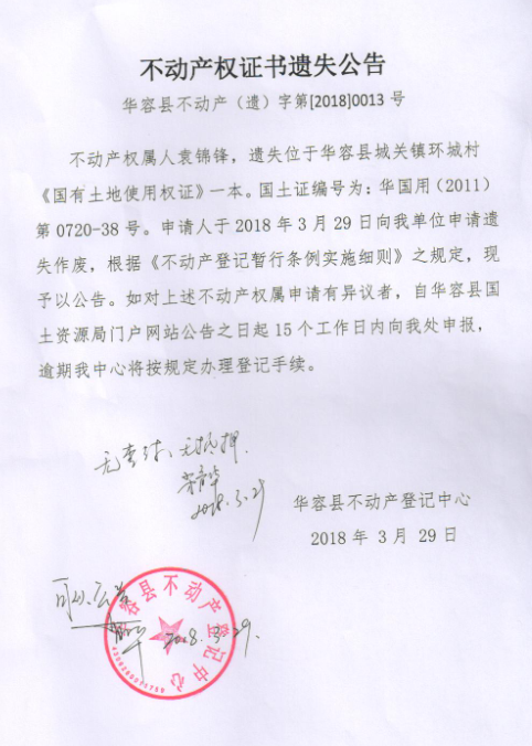 不动产权证书遗失公告【国有土地证(袁锦锋)】