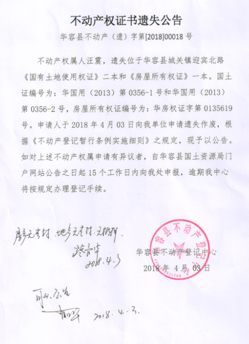 不动产权证书遗失公告【国有土地证 房屋所有权证(汪震)】
