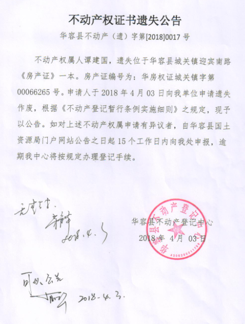不动产权证书遗失公告【房屋所有权证(谭建国)】