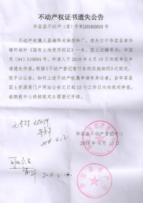 不动产权证书遗失公告【国有土地证(县湘华大米饲料厂)】