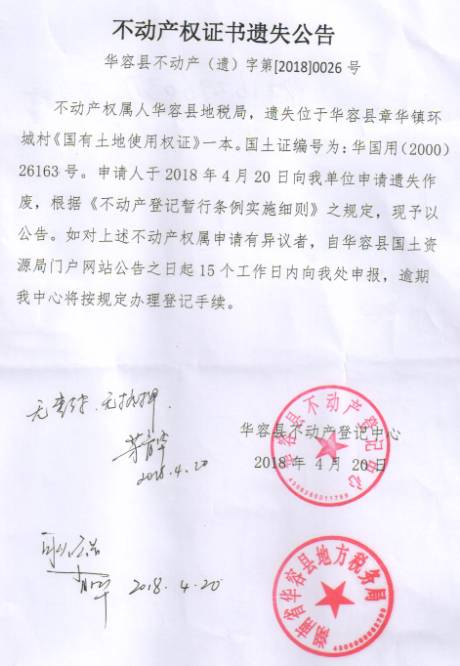 不动产权证书遗失公告【国有土地证(华容县地税局)】