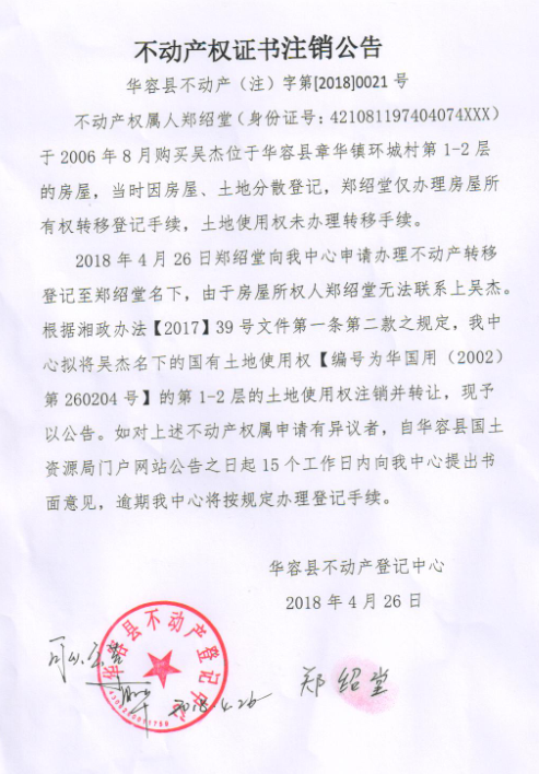不动产权证书注销公告【国有土地证(吴杰转郑绍堂)】