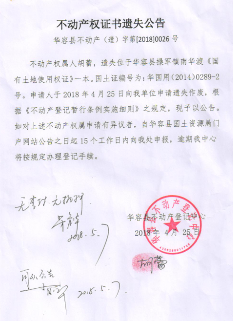 不动产权证书遗失公告【国有土地证(胡蕾)】