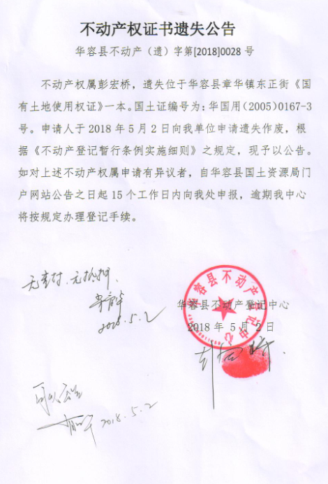不动产权证书遗失公告【国有土地证(彭宏桥)】