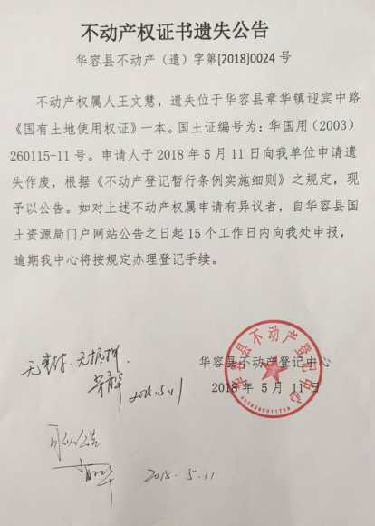 不动产权证书遗失公告【国有土地证(王文慧)】