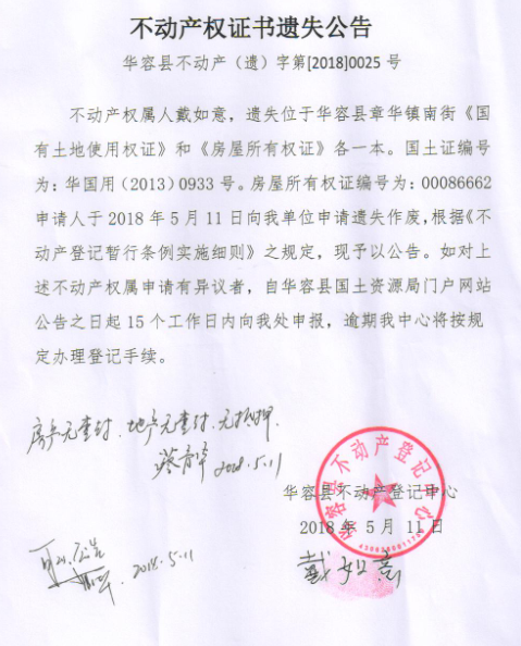 不动产权证书遗失公告【国有土地证 房屋所有权证(戴如意)】