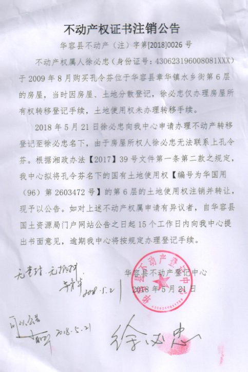 不动产权证书注销公告【国有土地证(孔令芬转徐必忠)】