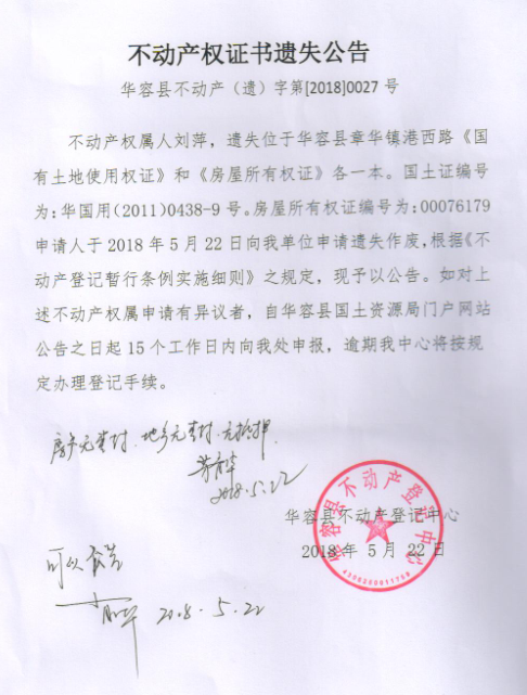 不动产权证书遗失公告【国有土地证 房屋所有权证(刘萍)】