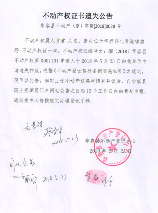 不动产权证书遗失公告【不动产权证(方君 刘星)】