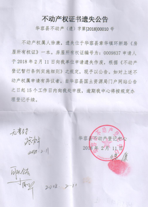不动产权证书遗失公告【房屋所有权证(徐康)】