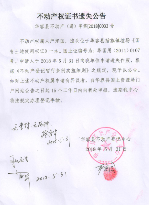 不动产权证书遗失公告【国有土地证(严定国)】
