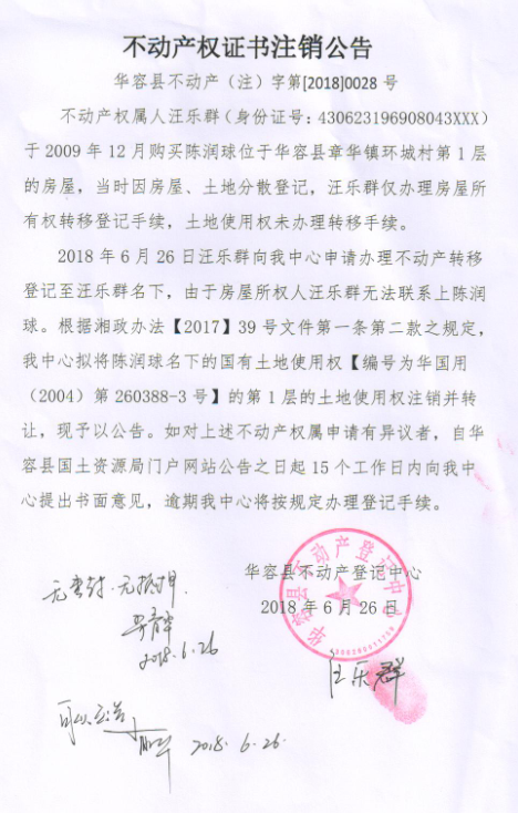 不动产权证书注销公告【国有土地证(陈润球转汪乐群)】