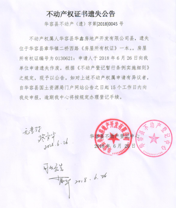 不动产权证书遗失公告【房屋所有权证(华鑫房地产开发有限公司)】