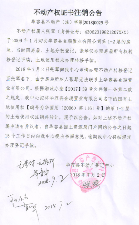 不动产权证书注销公告【国有土地证(金瑞置业转张琴)】