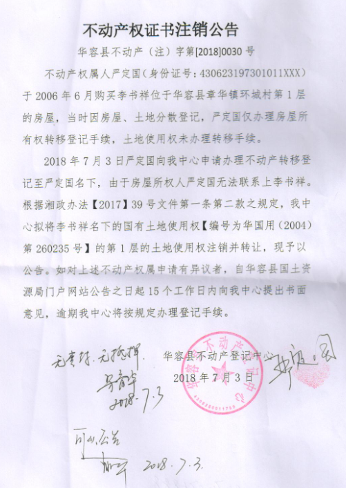 不动产权证书注销公告【国有土地证(李书祥转严定国)】