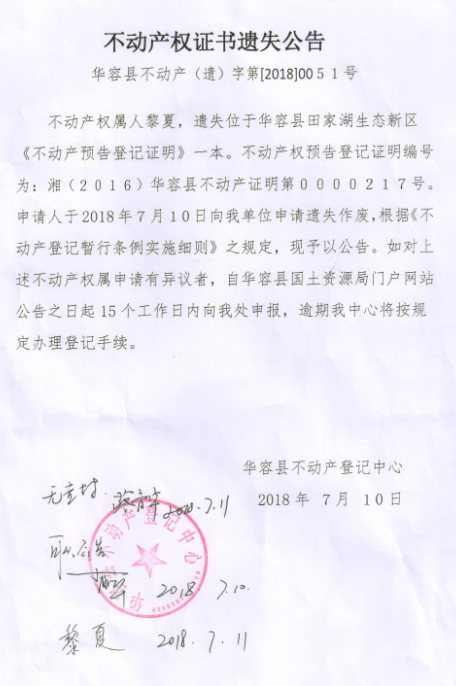 不动产权证书遗失公告【不动产预告登记证明(黎夏)】