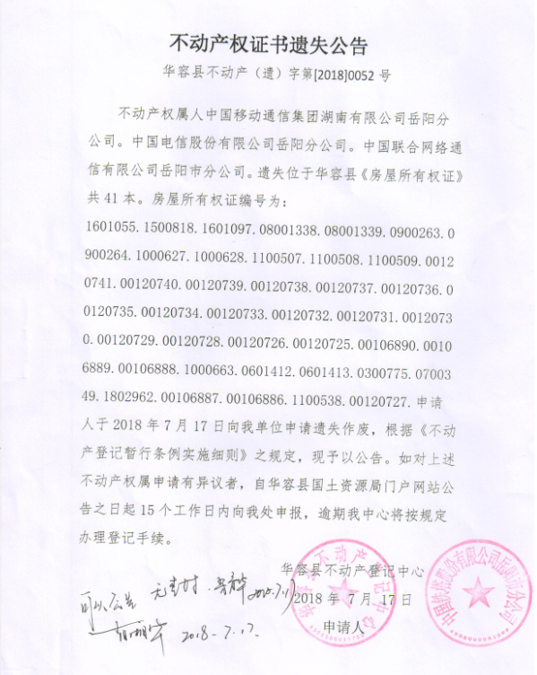 不动产权证书遗失公告【房屋所有权证(中国移动通信集团湖南有限公司岳阳分公司、中国电信股份有限公司岳阳分公司、中国联合网络通信有限公司岳阳市分公司)】