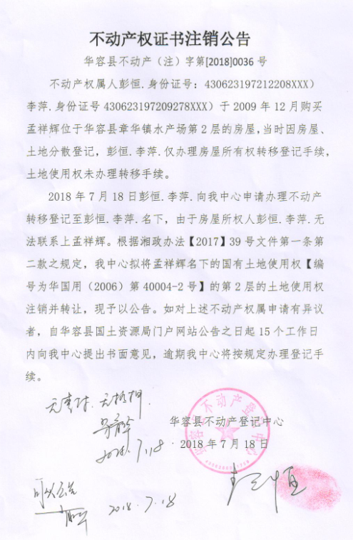 不动产权证书注销公告【国有土地证(孟祥辉转彭恒、李萍)】