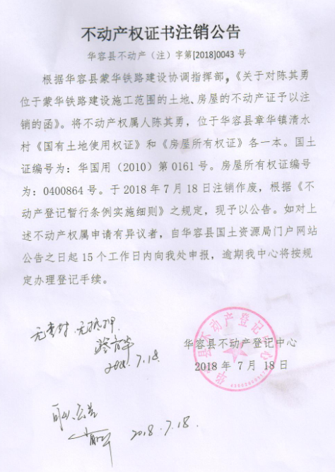 不动产权证书注销公告【国有土地证 房屋所有权证(陈其勇)】