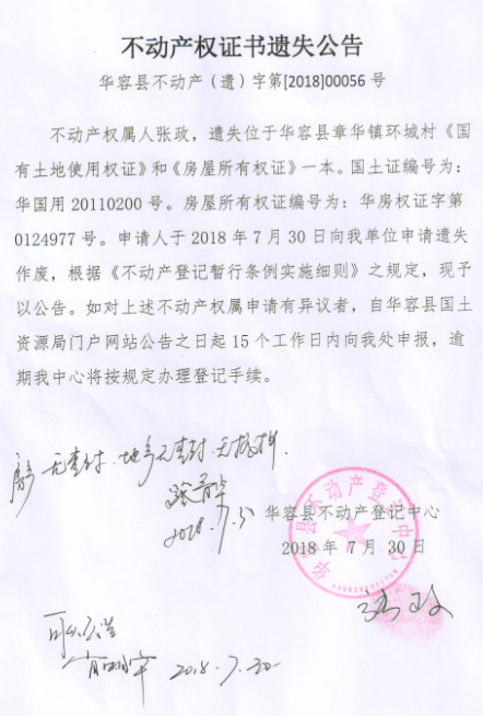 不动产权证书遗失公告【国有土地证 房屋所有权证(张政)】