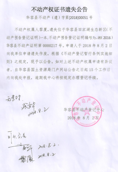 不动产权证书遗失公告【不动产预告登记证明(黎厦)】