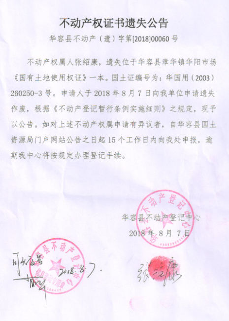 不动产权证书遗失公告【国有土地证(张绍康)】