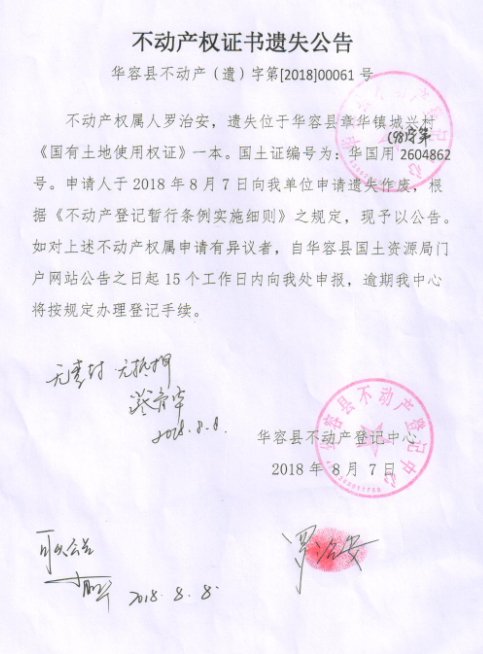 不动产权证书遗失公告【国有土地证(罗治安)】