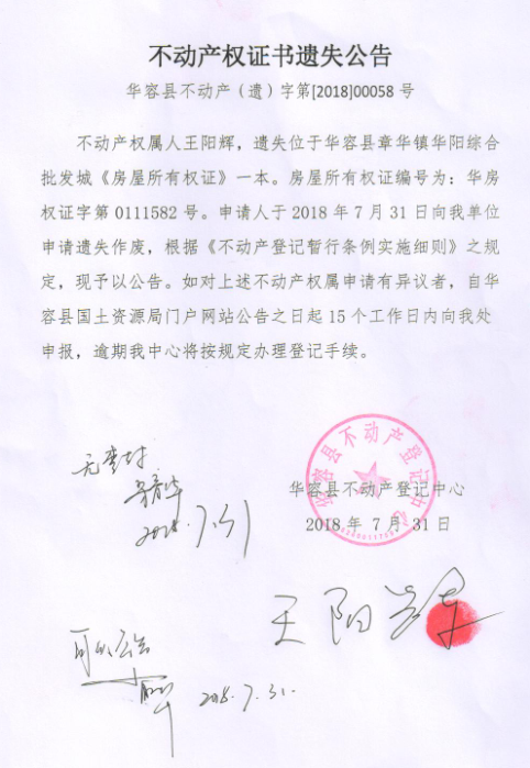 不动产权证书遗失公告【房屋所有权证(王阳辉)】