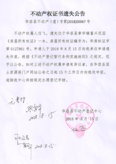 不动产权证书遗失公告【房屋所有权证(任飞)】