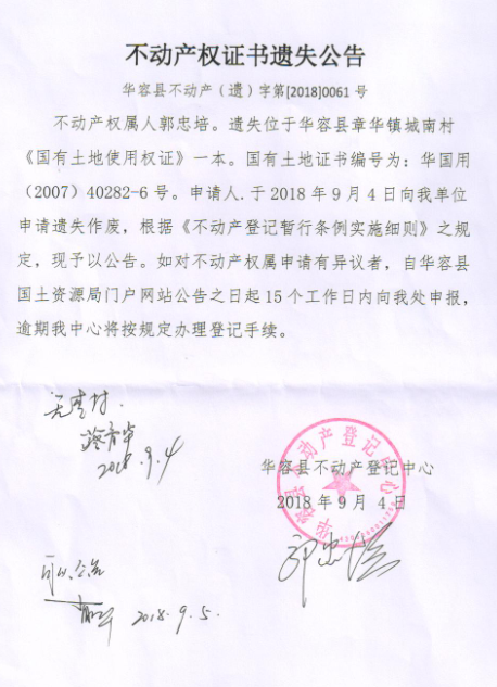 不动产权证书遗失公告【国有土地证(郭忠培)】