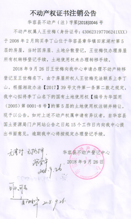 不动产权证书注销公告【国有土地证(李丁山转王世梅)】