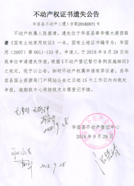 不动产权证书遗失公告【国有土地证(张碧清)】