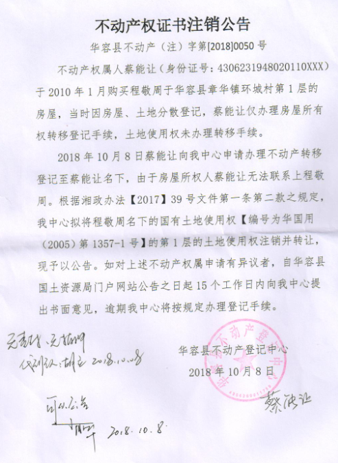 不动产权证书注销公告【国有土地证(程敬周转蔡能让)】
