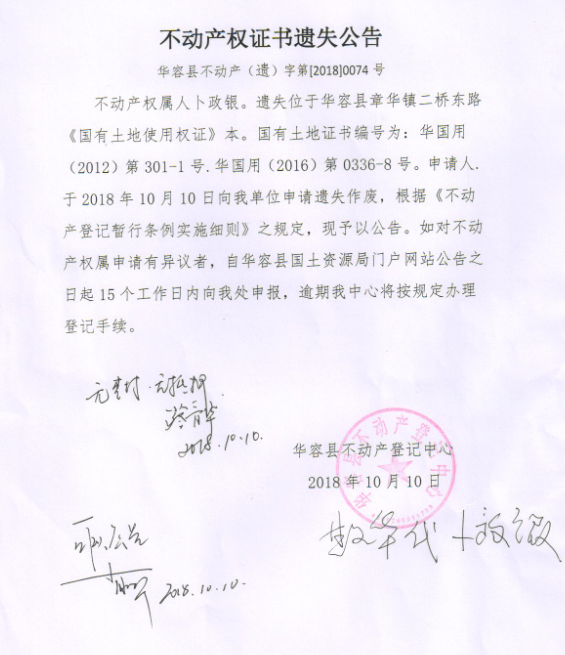 不动产权证书遗失公告【国有土地证(卜政银)】