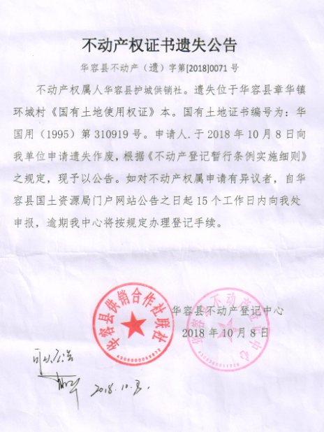 不动产权证书遗失公告【国有土地证(华容县护城供销社)】