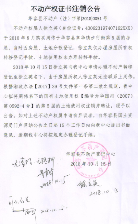 不动产权证书注销公告【国有土地证(周伟转徐立英)】
