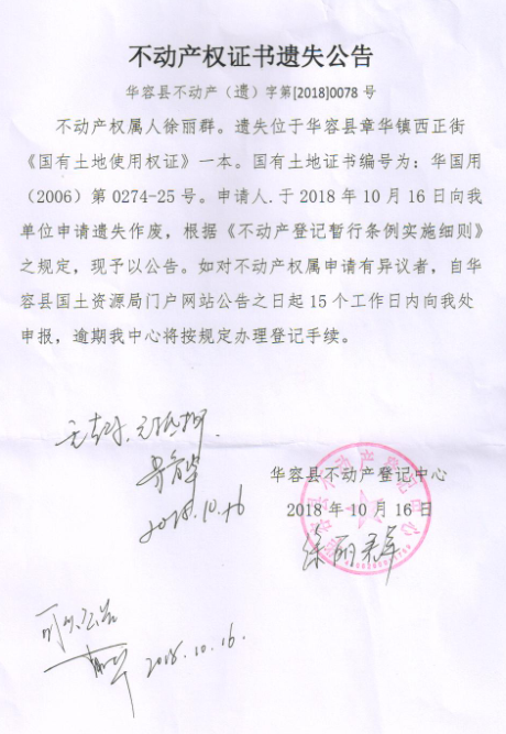 不动产权证书遗失公告【国有土地证(徐丽群)】