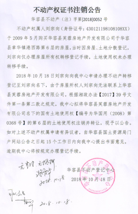 不动产权证书注销公告【国有土地证(华容县芙蓉房地产开发有限公司转刘宗向)】
