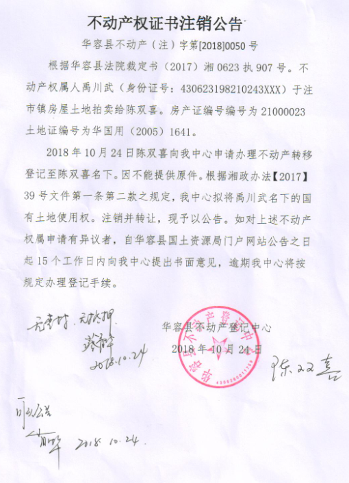 不动产权证书注销公告【国有土地证(禹川武转陈双喜)】