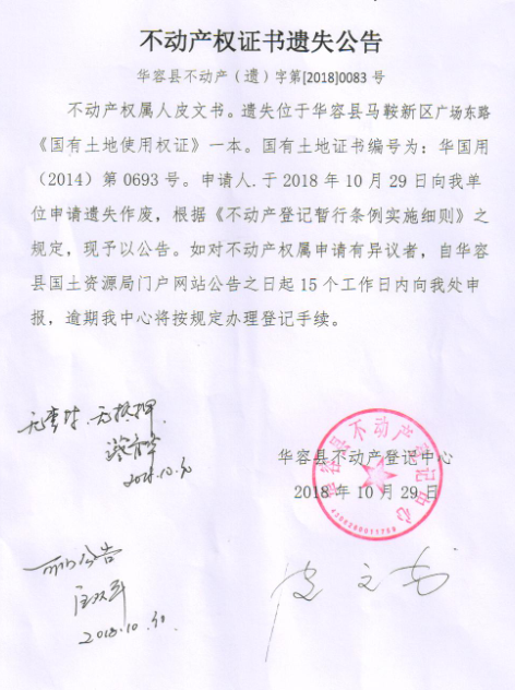 不动产权证书遗失公告【国有土地证(皮文书)】