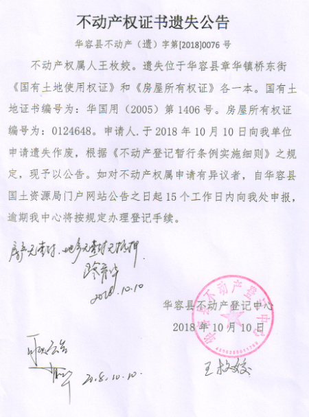 不动产权证书遗失公告【国有土地证 房屋所有权证(王枚姣)】