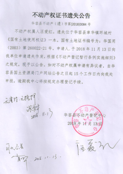 不动产权证书遗失公告【国有土地证(汪爱红)】