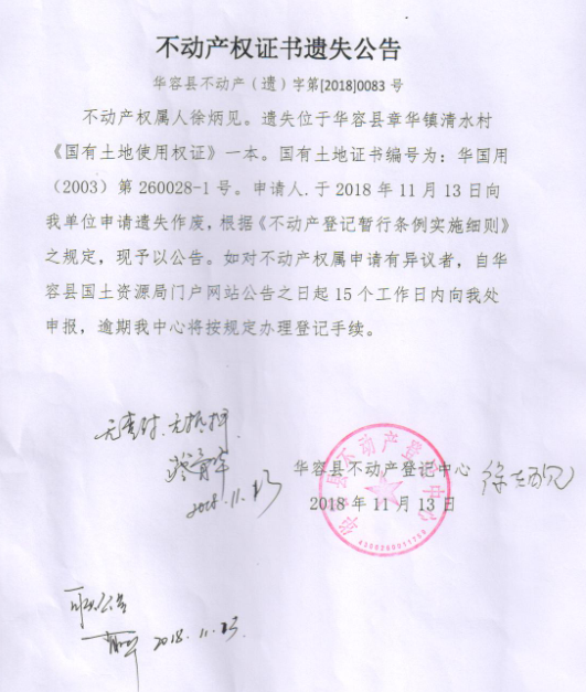 不动产权证书遗失公告【国有土地证(徐炳见)】
