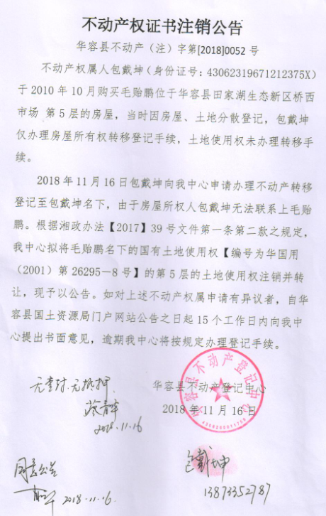 不动产权证书注销公告【国有土地证(毛贻鹏转包戴坤)】