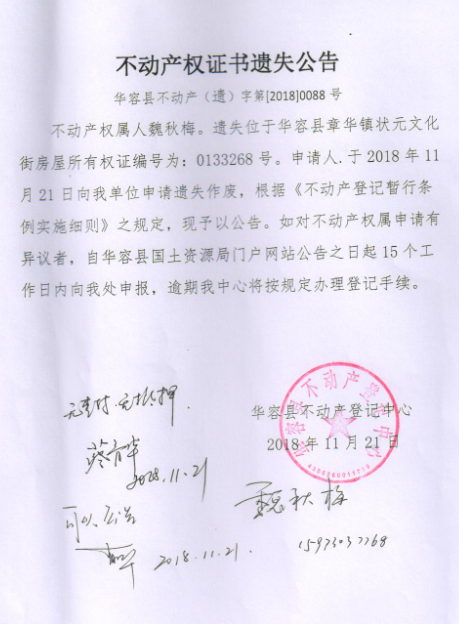 不动产权证书遗失公告【房屋所有权证(魏秋梅)】