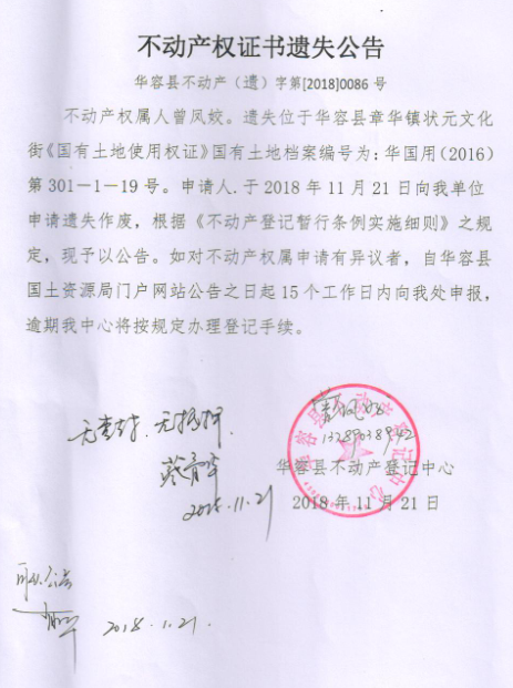 不动产权证书遗失公告【国有土地证(曾凤姣)】
