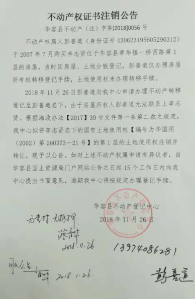 不动产权证书注销公告【国有土地证(李志贤转彭善道)】